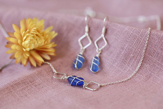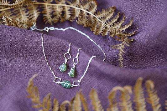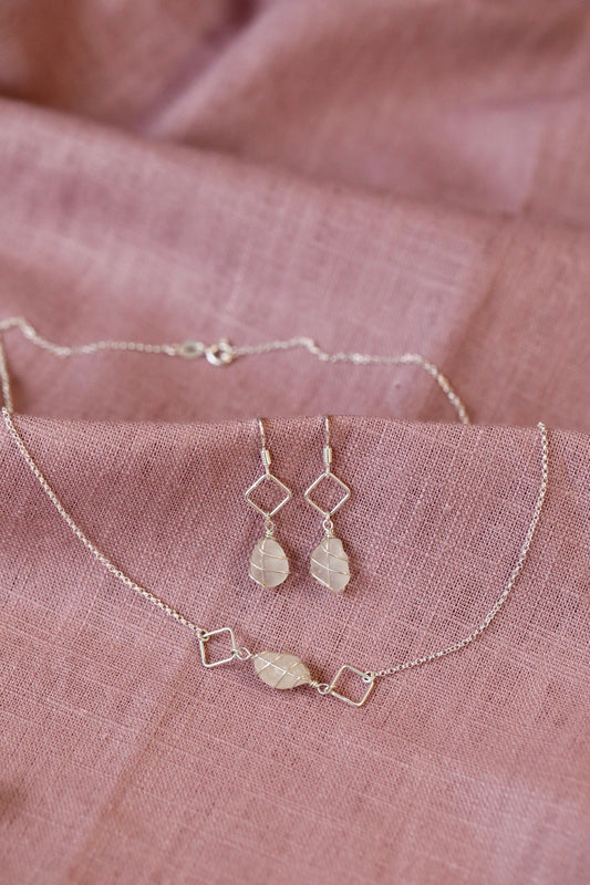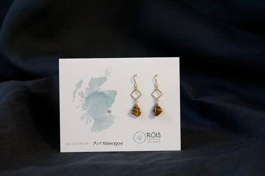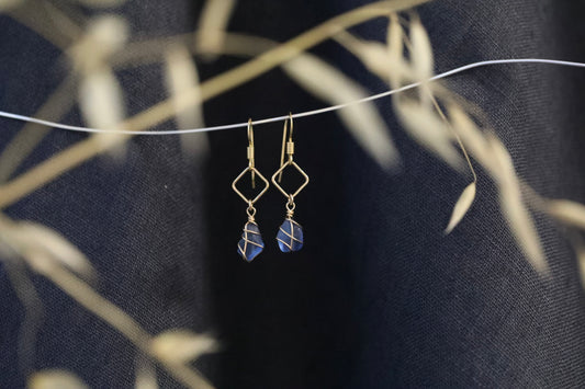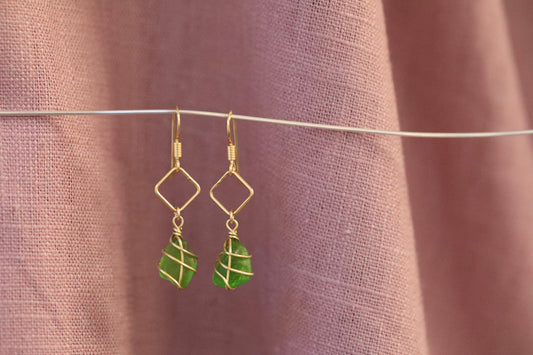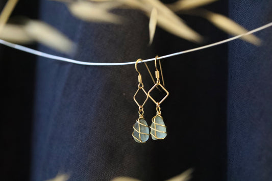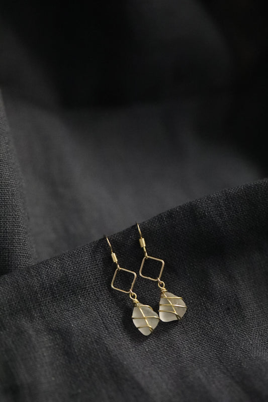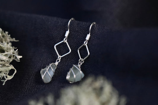 For lovers of geometric shapes and delicate designs. The Xanthe earrings holds a small piece of sea glass below a diamond accent
